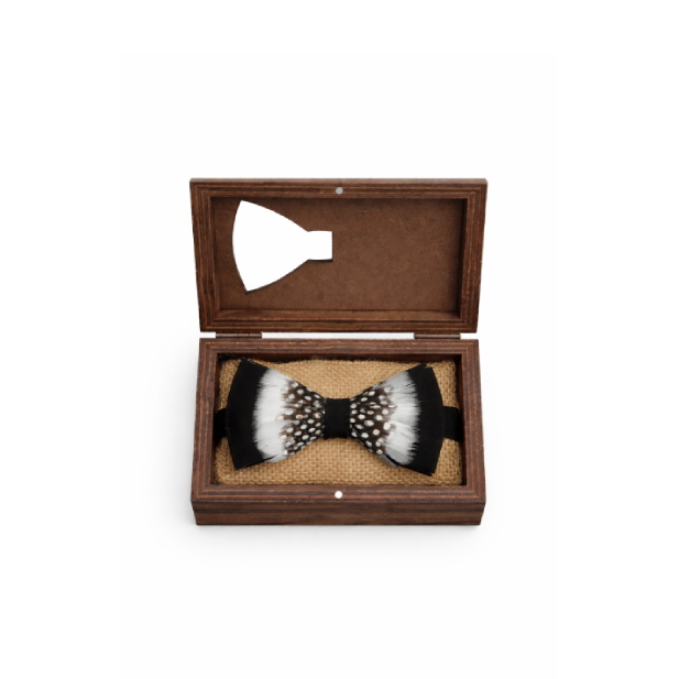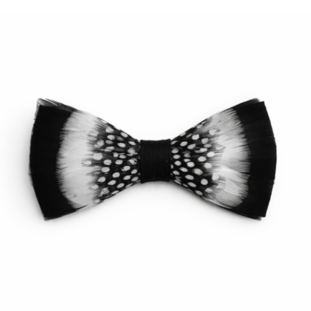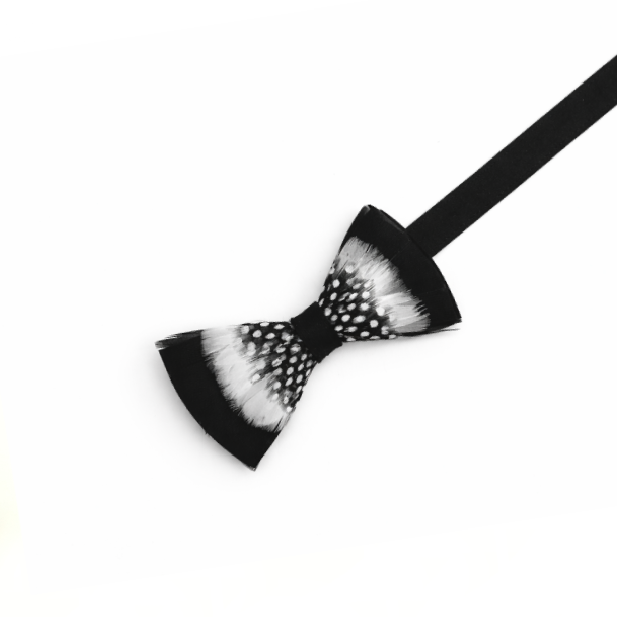 Bowtie Details: Black suede bow tie with Natural Guinea Hen Feathers and Black Turkey Feathers.
