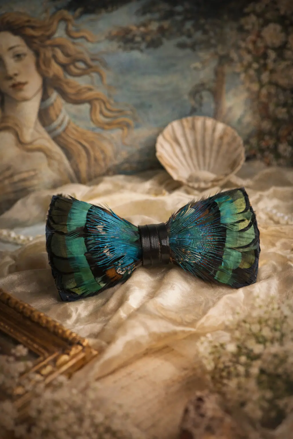 While creating the turquoise, emerald, and blue transitions in this handcrafted feather bow tie, this was exactly the atmosphere in my mind: the changing Florentine light throughout the day, the soft shadows of museum halls, and the sense of movement in Botticelli’s The Birth of Venus.